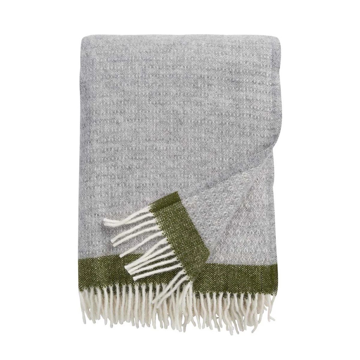 Plaid Hampus van Klippan is een heerlijk zacht plaid van ecologische lamswol. Het plaid heeft een klein ingeweven motief en is lichtgrijs met aan de twee zijdes franjes en een groene border.
