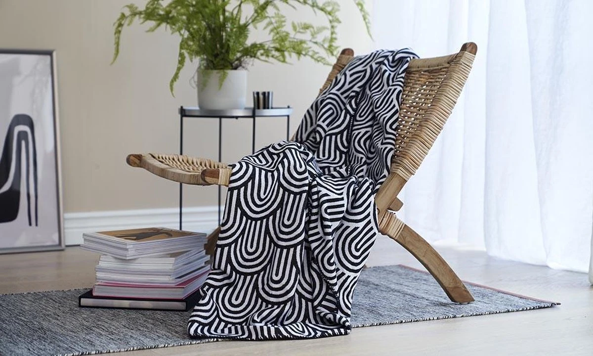 Arcade heeft een mooi ingeweven arcade motief dat refereert aan de arcade bogen die men in de architectuur kent. De basis van de deken is ecru en het motief is er met een zwarte draad ingeweven.