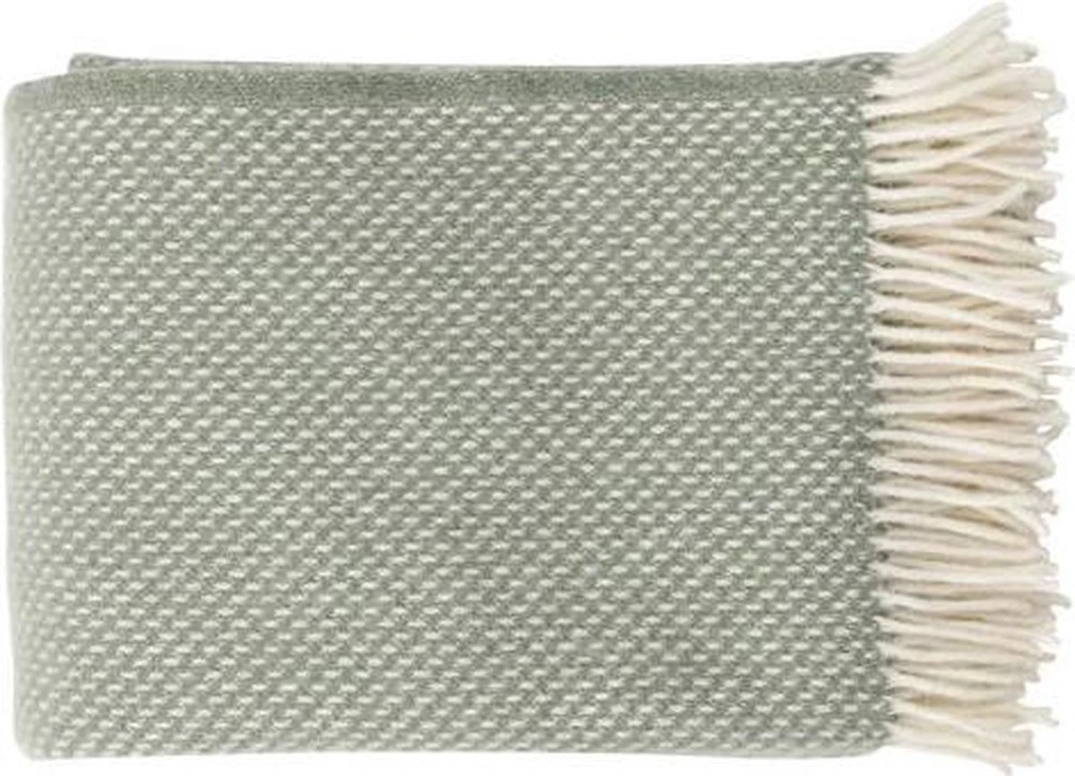 Plaid Preppy dusty green is een heerlijk 100% lamswollen plaid met een ingeweven witte draad. Het plaid heeft aan de uiteinden witte zachte franjes, zie afbeelding. De kleur groen is soft groen.