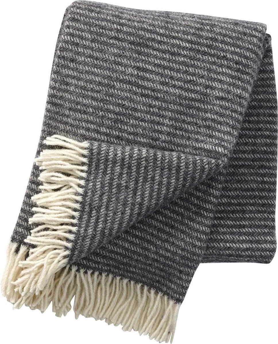 Heeft een ingeweven streep. De Ralph heeft net als veel andere Klippan plaids decoratieve witte franjes.
