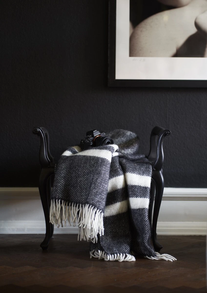 Plaid Gotland stripe black is een heerlijk warm plaid voor op de bank, kruip lekker weg onder dit fijne warme wollen plaid met een boek of je favoriete Netflix serie.. Een extra wollen deken in huis kan iedereen nu wel gebruiken, staat de verwarming een beetje lager, kruip dan onder een wollen Klippan deken.