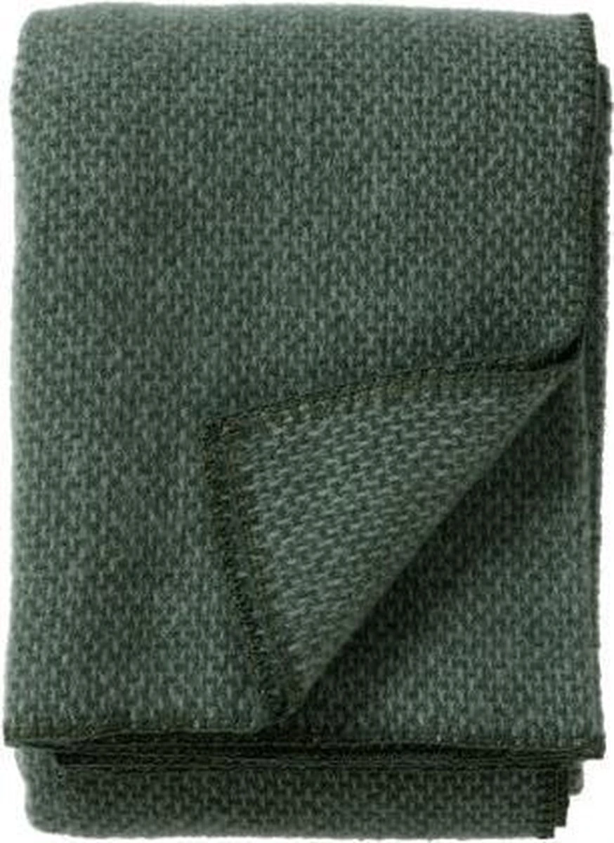 Plaid Domino is is een heerlijk 100% lamswollen plaid met een ingeweven motief in een diepe kleur groen het plaid is aan de randen mooi afgewerkt met een festonsteek, zie afbeelding.